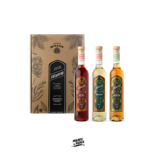 Un vinagre concentrado con alto nivel de acidez, elaborado a partir de vino Malbec, añejado en barricas de roble francés durante más de dos años. Como resultado, obtiene una complejidad y estructura que le confiere un carácter único.